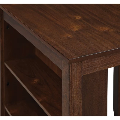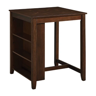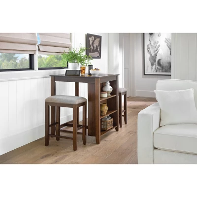 Create a cozy spot to enjoy your coffee in your kitchen or breakfast nook with the Regal Bar Height Dining set. The compact design, built with solid wood and wood veneer, is a stylish and practical solution for small spaces. Three integrated side shelves provide storage for your stem ware, coffee cups or whatever you love to display. Two upholstered bar stools are comfortably padded, and easily tuck under the table when not in use