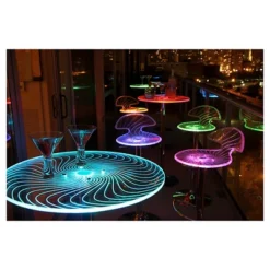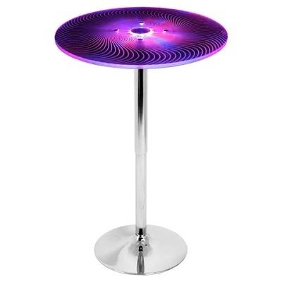 The Spyra Bar Table adds a colorful twist to your party with a glowing table top! It features a clear acrylic top with visibly etched swirls when both on and off. The Spyra Bar Table is supported by a chrome base and pole. Once the multi-colored LEDs hidden in the bar table are turned on and start to phase between red, blue and green, the table top glows for a fantastic look! The Spyra Bar Table includes a power adapter. On a full charge it can last up to 8 hours.