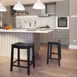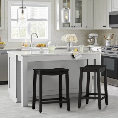 Coastal charm with a farmhouse flair embodies the Fiddler stool. Our versatile backless counter height saddle stool has a wide wood ship lap saddle seat, perfectly curved for added comfort and easily fits under kitchen islands or counter height spaces. The neutral black finish creates a stylish focal point for your dining space and is an easy addition to any decor. Durable wood flared legs add extra support and are complimented by perfectly a placed footrest adding an extra layer of comfort while eating, entertaining or working. Assembly is required.