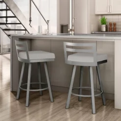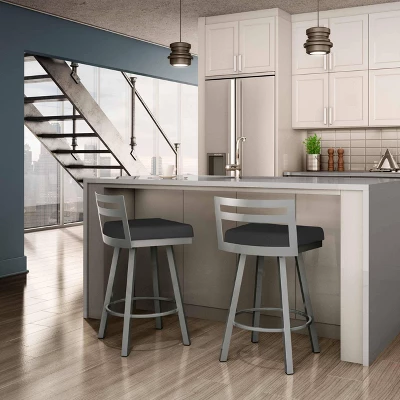 Add sleek and modern touch to your decor with the Derek swivel stool from Amisco. The sturdy metal barstool showcases geometric lines and a low back, creating a modern barstool perfect for your kitchen island. The swivel seat and upholstered cushion make for a comfortable seat while gathered around the kitchen counter or bar.