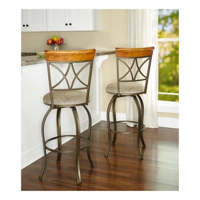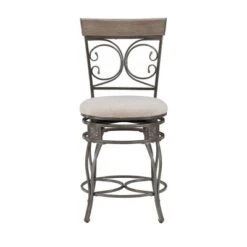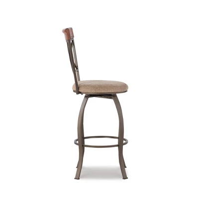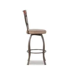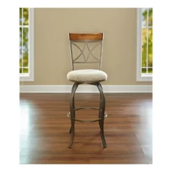 This Swivel Bar Stool features a diamond shaped back and slight curved legs. The top of the back piece is a sleek “Brushed Faux Medium Cherry” wood, while the frame is a “Matte Pewter and Bronze” metal. This piece is sure to add interest and extra seating to your table. Perfect complement to This Pub Table. Some assembly required.
