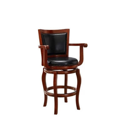 Boraam’s Jones Memory Swivel Stool made with solid hardwood and engineered with precision construction. Product tested by leading testing facilities recognizable worldwide, this barstool has a maximum weight capacity of 350 pounds. The Jones features a steel memory return-swivel mechanism, bringing your stool to its original position after removing static weight. The high-density foam seat and backrest cushion both upholstered in shiny black bonded leather and decaled with individual genuine brass nail heads. The footrest built from one solid piece of hardwood, gives you stability in addition to a durable metal kick plate protecting the top of the front-facing footrest from scuffs and scratches. Your eyes are not playing tricks on you; the seat of the Jones barstool indeed oversized with a diameter of 22 Inch! At last, you can sit comfortably with support where needed most, your derriere, back, arms and feet. The Jones is available in three different color finishes, cappuccino, black and cherry. Make a three piece set by pairing two barstools with Boraam’s Florence pub table in a matching color finish. Recommended for residential use only. Note: Seat height is measurement from floor to base of seat, and does not include additional height for seat cushion
