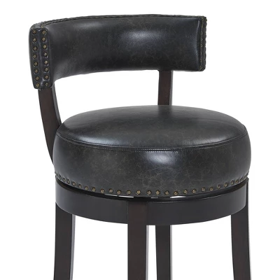 Ensure a comfortable, inviting, and stylish place to sit for your guests with the Corbin 30″ Bar Height Swivel Onyx Faux Leather and Espresso Wood Bar Stool from Armen Living. Luxurious faux leather upholstery meets beautiful wooden legs in a marriage of classic and contemporary style. The back rest and seat feature a nail head trim that creates a sense of structure and dimensionality that pairs perfectly with the graceful curves and flared legs. The back and seat are cushioned in high-density foam and covered in faux leather upholstery that provides you and your guests with comfortable easy seating for hours on end. The 360-swivel function allows for optimal mobility and allows you to easily engage with all your guests regardless of their place in the room. The armless design makes it easy to pull the Corbin bar stool up to your kitchen island, peninsula counter, or home bar. The Corbin kitchen stool is available in 26” or 30” seat height and upholstered in Brown Onyx faux leather with your choice of an Espresso or American Gray wood finish.