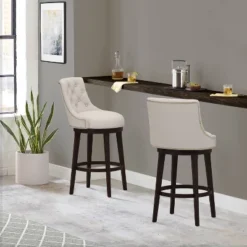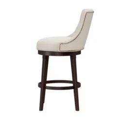 The Hillsdale Furniture Halbrooke Swivel Bar Stool is ideal for any breakfast bar seating and bar height dining. The barstool has a cream upholstery with low English arms and button tufting bringing a sense of traditional style. The simple Chocolate finished wood base and nail head trim add a modern flair. A convenient footrest and 360° swivel seat round out the concept and make this bar height stool a relaxing experience for diners and guests. Assembly required.