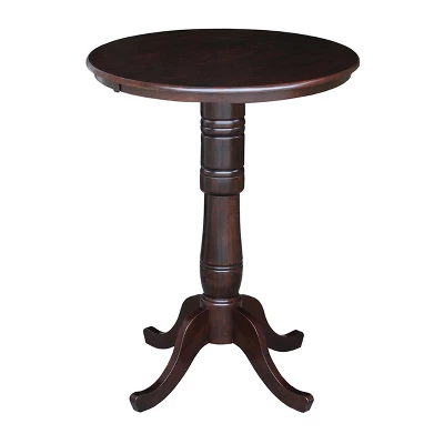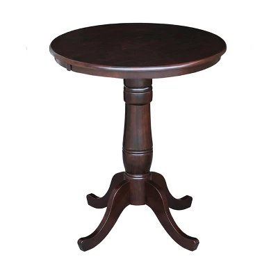 For those who appreciate high quality wood furniture with a traditional and elegant look. International Concepts home furnishings will complement any décor. This Round Table is made of solid wood ensuring years of use. It features a butcher block top and a pedestal base with four feet for maximum support. It has a rich, mocha finish. The table measures 30″ W x 30″ D, and is available in counter height and bar height options. The counter height table is used with counter height stools and is 34.9″ H. The bar height table is 40.9″ H and is used with bar height stools. This Solid Wood table ships ready to assemble.