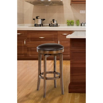 Simple and versatile, the Hillsdale Furniture Brendan Backless Swivel Bar Height Stool has a Brown Cherry wood finish and Brown faux leather upholstery that blends seamlessly with most décor. Its padded seat and 360° swivel functionality make this bar height stool comfortable and convenient — while the perfectly placed footrest makes it easy to relax and reinforces the structural integrity of the swivel wood stool. Ideal for kitchen islands and bar-height dining tables. Assembly required.