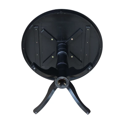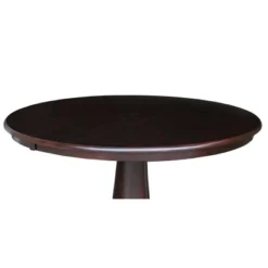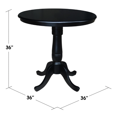 For those who appreciate high quality wood furniture with a traditional and elegant look. International Concepts home furnishings will complement any décor. This Table is made of solid wood ensuring years of use. The table features a butcher block top and a pedestal base with four feet for maximum support. It has a handsome, black finish. The round table top measures 36″ W x 36″ D, and is available in standard dining height, counter height, and bar height options. The standard dining height table is for use with dining chairs and is 28.9″ H. The counter height table is used with counter height stools and is 34.9″ H. The bar height table is 40.9″ H and is used with bar stools. This Solid Wood table ships ready to assemble.