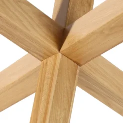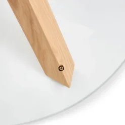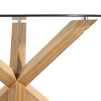 Introduce an element of exquisite style and inviting lightness with this stunning glass dining table. Boasting a wood base crafted in solid rubberwood with an American White oak veneer, three angled posts intersect to create a star-inspired silhouette. A thick round of tempered glass rests on top, allowing an artful focal point to stand front-and-center. Enjoy an indulgent, intimate dinner or create a stylish spot for coffee and a croissant.