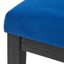 Enhance your dining room with the sophistication and comfort of the North Bay 5-Piece Round Dining Set from Buylateral. The generous tabletop surface measures 59.1 inches wide, providing ample room for serving pieces and place settings, with enough room to seat up to six comfortably. Designed with a unique tapered pedestal base that offers a sleek Mid-century style. Coordinating armless dining chairs are generously cushioned and upholstered in a lush Navy velvet with an Ebony Black finish. The substantial pedestal base is crafted of solid rubberwood and topped with a veneered MDF tabletop in a matching rich Ebony Black finish. This set offers the ideal dining experience, creating a perfect statement in any contemporary interior.