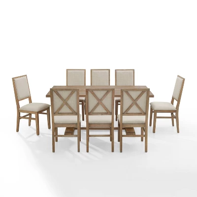 Gather together in modern farmhouse style with the Joanna 9pc Dining Set. The large rectangle trestle table pairs beautifully with the upholstered dining chairs, offering seating for up to eight diners. Each chair features upholstered backs and seats with a classic wooden X design on the back. Balancing the table’s substantial trestle base is a spacious tabletop, making the Joanna 9pc Dining Set an ideal spot for a family celebration or dinner party.