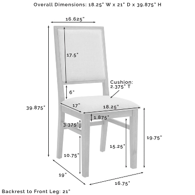 - Chairs have an upholstered back in creme linen with wood X detail on the back
