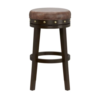 Simple and studded, the Hillsdale Furniture Benard Backless Swivel Bar Height Stool has a downplayed design. This wood bar stool features oversized nail head accents and welt piping around the seat to add visual interest. Its unique deep smoke brown wood finish and weathered dark brown upholstery make it an ideal addition to most color palettes and décors. A perfectly placed footrest and padded seat with 360° swivel functionality offer a relaxing experience to you and your guests. Perfect for use at kitchen islands or bar height dining tables. Assembly required.