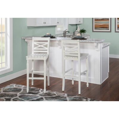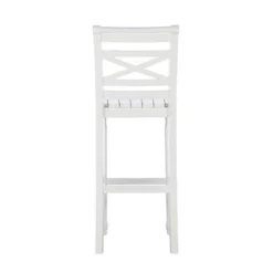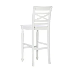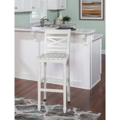 The Bristol Bar Stool is perfect for your casual home décor. The stool features a planked seat and white finish, while the tall back provides great support and has a small “X” motif detail. The turned legs add to the style and have stretchers for added stability. This barstool can support up to 275 pounds. Adult assembly is required, tools are provided.