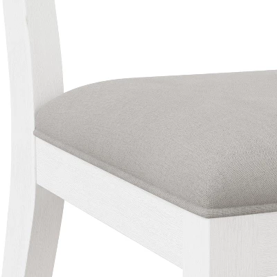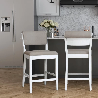 When we gather to eat and drink, we make memories that will last a lifetime. This sturdy wood frame constructed counter height stool is built to last whether you’re enjoying a glass of wine with friends at your home bar or breakfast with your family in the kitchen. Relax on the comfortable upholstered sleigh back seat panels of this stationary counter stool. Cleanly designed, the fog gray upholstery and sea white wood finish make this stool a perfect fit for any decor, from traditional settings to farmhouse. No assembly required.