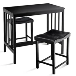 The 3 Piece Counter Set with space saving convenience. This set features a simple rectangular table on long sturdy legs with two backless counter height stools with padded, black PU seat covers. Featuring powder coated steel and MDF (medium density fiberboard) construction, the rich dark finish adds an elegant touch that will blend with most decor styles. Perfect for a kitchen nook, this durable and lovely set will help you make the most of smaller spaces!