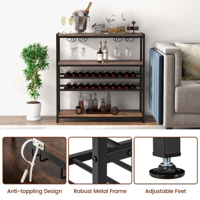 Do you want to own a mini home bar? Our industrial wine bar table is a nice option for wine lovers. It has 2-tier wine rack and 4 rows of glass holders f or you to collect 20 glasses and 22 wine bottles. Plus, 1 wide top, 1 middle shelf and 1 bottom shelf provide additional storage space for fruit plates, dishes and small kitchen appliances. You can use it as a bar cabinet, wine rack table, display rack or buffet table in different places. Additionally, with solid metal frame and adjustable feet, our wine bar cabinet allows for excellent durability and stability. Meanwhile, it is also equipped with anti-toppling devices for extra sturdiness.