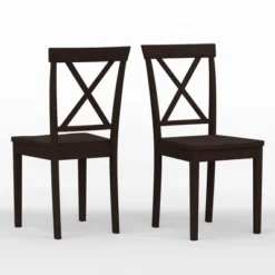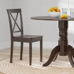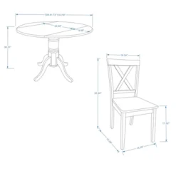 - 42″ Solid Wood Pedestal Base Double Drop Lead Dining Table dimensions: 41.73″ W x 23.62″ – 32.68″ – 41.73″ D x 30.31″ H; Table Top Thickness: .79″; Drop Leaf Depth: 9.06″; Pedestal Base 6.5″ Diameter x 22.84″, Top Fluted Section: 5.51″ H, Curved Mid-Section: 7.28″ H, Bottom Fluted Section: 10.05″ H.; X-Back Dining Chair dimensions: 35.04″ H x 16.54″ W x 19.29″ D; Seat height from floor: 17.52″; Seat dimensions: 16.14″ W x 15.55″ D x .87″ H; Width between Rear Legs at Seat: 12.6″