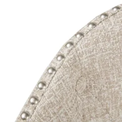- Low seat back with a barrel shape, button tufting on interior side, and metal nail heads