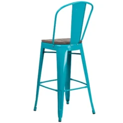 Add some color to your décor with this sturdy metal stool with textured wood seat and integrated footrest. The powder coated frame with underseat bracing holds up to 500 lbs. static weight and rubber floor glides protect your indoor flooring surfaces. Assembly takes less than 10 minutes for quick setup in the kitchen, dining room or sunroom. Additional Features: Protective Underseat Bracing Caps Prevent Finish Damage When Stacked, Assembles in Under 10 Minutes, Item Size: 18″W x 19″D x 46″H; Seat Size: 14″W x 14″D x 30″H; Back Size: 18″W x 18″H