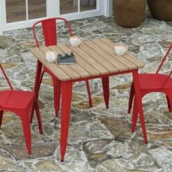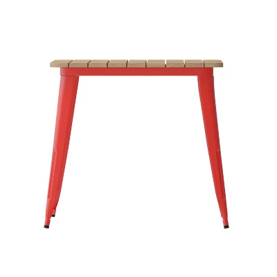 Refresh the look of your indoor or outdoor spaces with the stylish design of this 31.5″ square dining table. Featuring a slatted poly resin top paired with a steel frame this contemporary yet rustic table will blend in almost any decor. Thoughtfully crafted with a poly resin top and a 20 gauge steel frame that will hold up to 300 lbs. static weight this patio table ideal for year round use. Pair with other items in the collection for a cohesive look throughout your home.