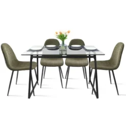 - Rectangular table with gold metal legs is equipped with an anti-scratches . A crisscross support beam brings stability to this clear tempered glass top (Included rounded corners to protect you and your family) Suitable for all type dining chairs.