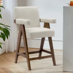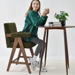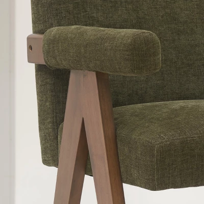 Kim Kardashian makes V-leg Chandigarh Chair popular, and we bring more pop of color. The upside down “V” shape design is the core spirit of this collection. With a relaxed, casual flair inspired by Scandi design, this modern two-tone chair contrasts its rich exposed-wood legs with the nubbly charm of its upholstered seat, back and arms.Thanks to the brilliant material duet, SOLID WOOD leg in warm walnut tone with contrast of the DECENT FABRIC makes this chair timeless classic but modern. The seat has GENEROUS PADDING, along with a slightly PITCHED back support for comfortable reading or snap, and the arm is fully upholstered as well. Never compromises on details, the edge of each piece of wood is polished, you could feel warm, round, safe edge when you touch it.This beautiful fabric is SOFT, THICK and DURABLE (375g). The RICH, SATURATED HUES gives your space an elevated touch. You will never know what we are going through to make this OLIVE GREEN (or you can call it moss green), fabric mill sampled the color swatch at least 5 times, and finally, we get our OLIVE GREEN! The most satisfying OLIVE GREEN!We have dining chair, counter stool and bench in same collection, you could complete your home look with the rest pieces, that will make your house look an expensive custom home without spending a ton of money.