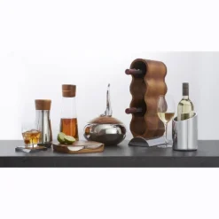 - Resting on its Nambé Alloy metal base, the rack’s acacia wood form curves rhythmically to create spaces for 4 bottles