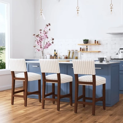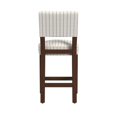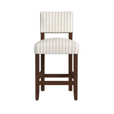 This open back counter stool has a padded backrest and seat, wrapped in a black and white woven fabric, offer long-lasting support while dining or enjoying conversation over a cocktail or glass of wine. Simple and streamlined with fresh, thoughtful details. Seat back and cushion features stain resistant fabric that is ideal for spill-prone areas like the dining room, eat-in kitchen and breakfast nook. The straight-lined legs are finished in a dark walnut stain, giving it a sleek look that complements any decor. Some Assembly Required