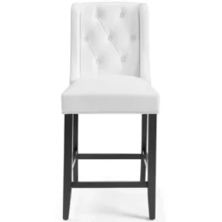 Bestow splendor with the Baronet Tufted Button Upholstered Faux Leather Counter Stool. Featuring dense foam padding, sinuous spring support, and smooth faux leather upholstery, enjoy a luxe seating experience with this luxurious tufted button counter bar stool. Complete with sleek curves and dignified form, this modern counter stool with solid wood legs with stretcher supports and non-marking foot caps is the perfect choice for the dining seating area. Counter Stool Weight Capacity: 500 lbs.