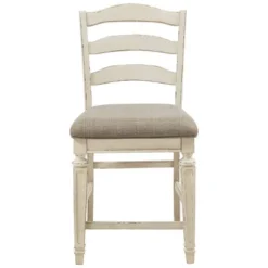 Designed to serve you with great comfort, this Counter Height Barstool will be an exquisite addition in your home. The foam padded seat is upholstered in textured brown fabric, while the frame is made from solid wood in a distressed white finish, featuring a curved ladder back. Set of 2 Barstools