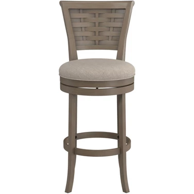 This rustic yet sophisticated bar stool is sturdily crafted with a durable wood frame in a light antique gray wash with a 360-degree swivel seat wrapped in an easy-to-maintain putty beige upholstery. To support you and your guests while you share meals or conversation, a high back with a basket-weave detail provides the perfect resting place. Bold enough while still being neutral, this wood stool easily adapts to many decor styles. Assembly required.