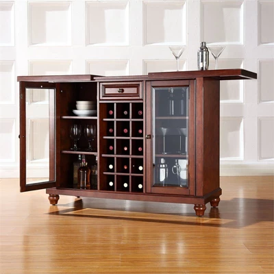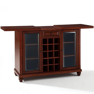 Elegantly entertain guests with this sliding top bar cabinet constructed of solid hardwood and wood veneers. The beautiful beveled/tempered glass doors and raised panel drawer front are classically styled to enhance any home decor. The sliding top expands to greatly increase the size of your serving area. Behind the two doors, you will find adjustable shelves and plentiful storage space for spirits, appliances and other items that require additional space. The center storage area is great for up to 15 bottles of wine, or if you prefer, remove the wine storage cubes to reveal an adjustable shelf. Style, function, and quality make this sliding top bar cabinet a wise addition to your home. Features:Sliding Expandable TopSolid Hardwood & Veneer ConstructionHand Rubbed, Multi-Step FinishBeveled / Tempered Glass DoorsAntique Brass Finish HardwarePlenty of Room for Storing Barware & SpiritsDoubles as a Serving Station when EntertainingAdjustable Levelers in LegsConstruction Material: Solid Hardwood and Wood VeneersSpecifications:Overall Product Dimensions: 36″ H x 47.75-64″ W x 20″ DProduct weight: 220 lbs.