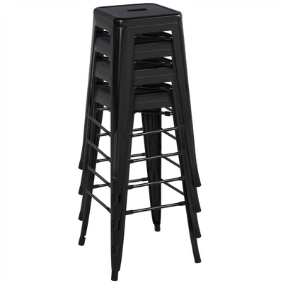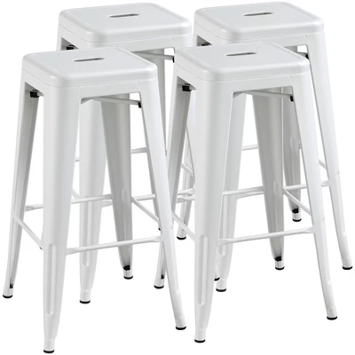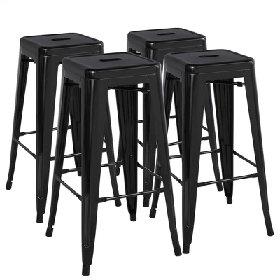- Selected materials, exquisite technology, a variety of colors to choose from, these bar stools show the perfect combination of art and life. They are practical and comfortable. Our stylish modern bar stools are made of metal with powder coat finish. They are widely used in the kitchen, dorm room, and bars, etc. They are designed with footrests to provide additional comfort. Four pieces of metal high chairs are sold together, suitable for matching your kitchen counter, economical and practical!